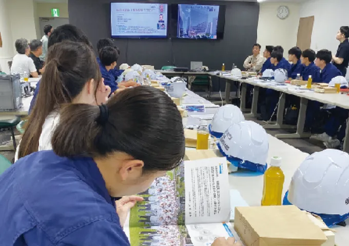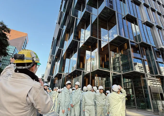 福岡県出身の重松象平氏デザインによる次世代ビルの建設現場を見学しました。生徒たちは巨大な地下空間に圧倒され、地下工事1年、上階工事1年という工期の説明に、建設工事の規模と複雑さを実感。斜めの柱の寸法やクレーン作業スペースなど、具体的な質問が飛び交い、建設技術への関心の高さが伺えました。